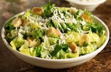 Romaine lettuce, croutons, grated romano cheese and a garlic knot.